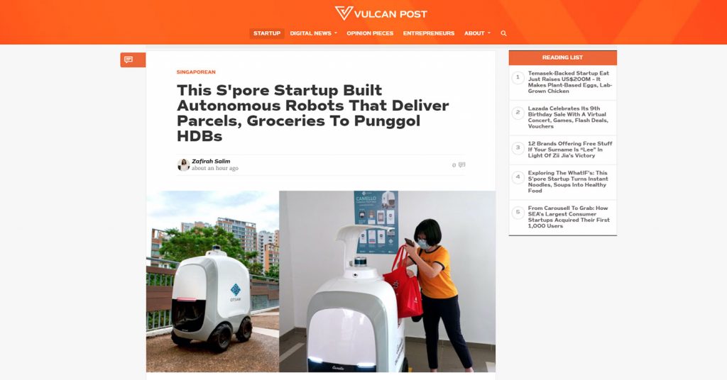 Vulcan Post: 這家新加坡初創(chuàng)企業(yè)打造自動(dòng)機(jī)器人,用于配送食品雜貨、包裹到榜鵝 (Punggol) 的政府組屋 (HDB)