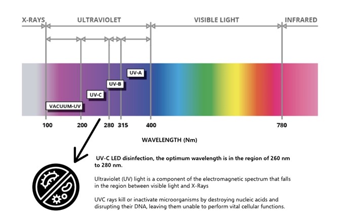 紫外線光 的波長光譜為 100 nm 至 380 nm,波長可分為三個區(qū)域: UVA (320 nm 至 400 nm)、UVB (280 nm 至 320 nm)、UVC (200 nm 至 280 nm)。最佳的消毒 UV-C 波長是 260nm 至 280nm。